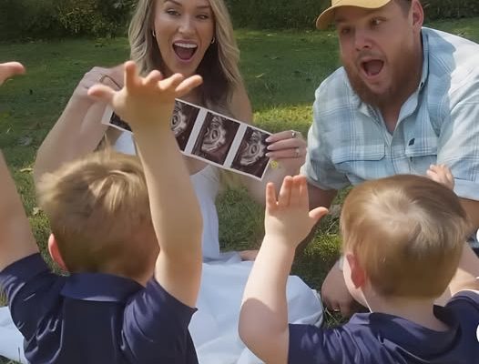 The clip shows Luke and Nicole sitting on the grass with their boys. Nicole pulls out an ultrasound photo from behind her back, revealing the exciting surprise. Tex and Beau immediately throw their hands up in the air, matching their parents’ joyful smiles.