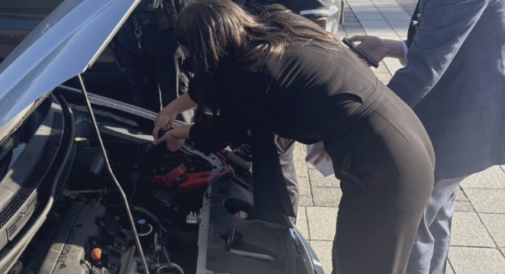 Alexandria Ocasio-Cortez looks under the hood of a stranded motorist’s car; Photo Credit: mike casca/X