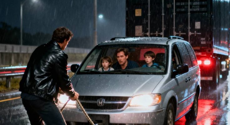 Then, up ahead, I caught sight of flickering hazard lights — weak and fading in the distance. As I drew closer, they revealed a dark SUV stranded on the shoulder, hood up, completely lifeless. A man stood beside it, drenched and waving a flashlight with the kind of desperation that only comes from fear.