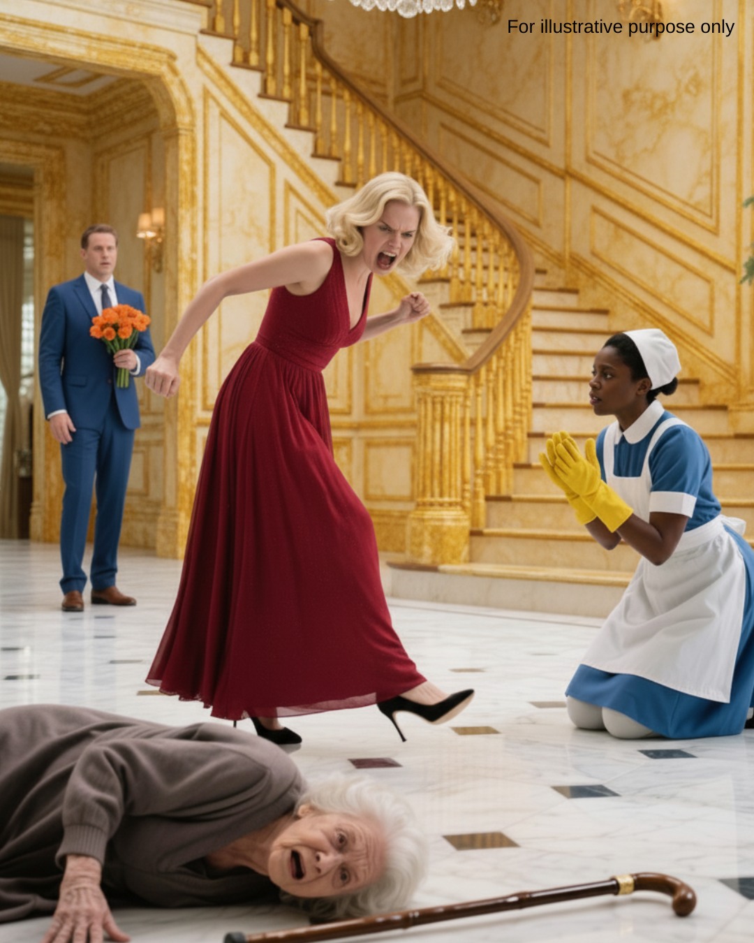 His fiancée, furious and unhinged, her heel still raised from the last strike.