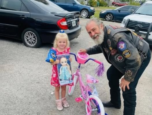 One by one, the bikers came forward with presents. A baby doll. A tea set. Books. Art supplies. Hair bows. Clothes. Shoes. A backpack for school. Everything a little girl could want.