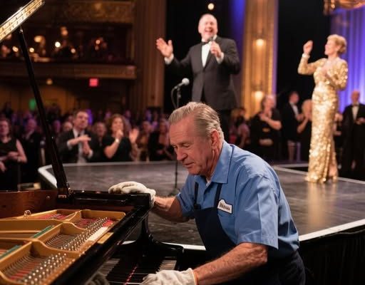 Jack Hollis moved through the elegant concert hall like a whisper—present but unseen. At thirty-nine, he carried himself with quiet precision, the kind that comes from years of hard work and humility. His hands, worn but steady, treated the shining Steinway grand piano as if it were sacred. Each careful stroke of his cloth wasn’t just cleaning—it was remembrance.