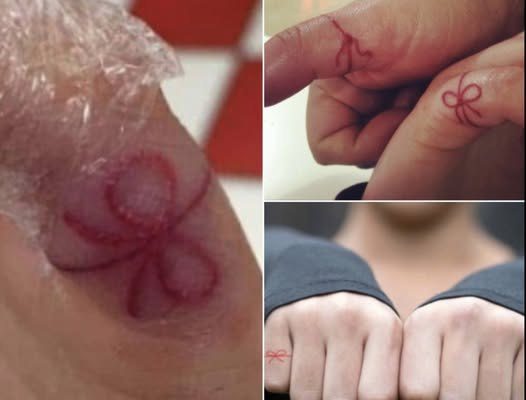So I did a little digging – thanks, internet – and found that the red string tattoo in question is known in Asian cultures as the ‘red string of fate’. Most commonly appearing on the thumb of a man and the pinky finger of a woman, the tattoo looks like a simple bow with tails, not unlike a tied shoelace.