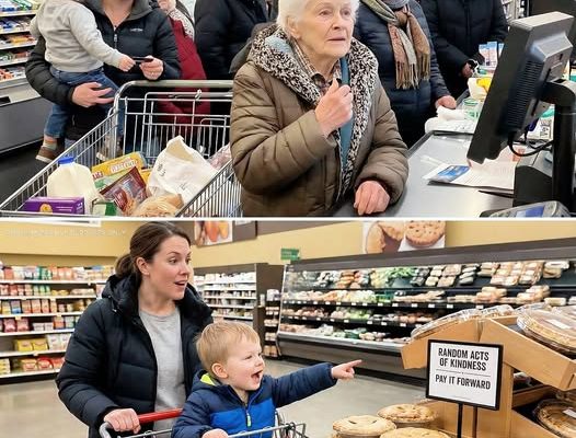 Ahead of us stood an elderly woman with silver hair wound into a neat bun, the kind that said she’d lived through harder times than mine. Her cart held the basics—milk, potatoes, a can of soup, bread—and one treat: a small apple pie, golden under its crinkled package.