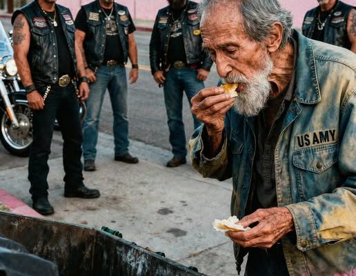 Arthur’s hands shook as he unwrapped the first burger. He took a small bite, closed his eyes. The bikers talked around him, including him without pressuring him, letting him eat with dignity.