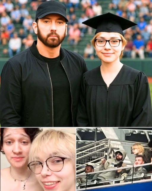 As the graduation began at 05:24 AM EDT (04:24 PM +07), adjusted for Detroit’s time zone, students in caps and gowns filled the auditorium, unaware of the surprise awaiting them. When Stevie’s name was called, a figure in a black hoodie slipped through a side door, taking a seat in the back. Whispers turned to gasps as the crowd recognized Eminem, his trademark buzzcut and intense gaze unmistakable. The school erupted—students screamed, parents stood on chairs, and even the principal fumbled her speech. Stevie, on stage, broke into a wide grin, mouthing, “Dad?!” as Eminem waved, his eyes glistening with pride.