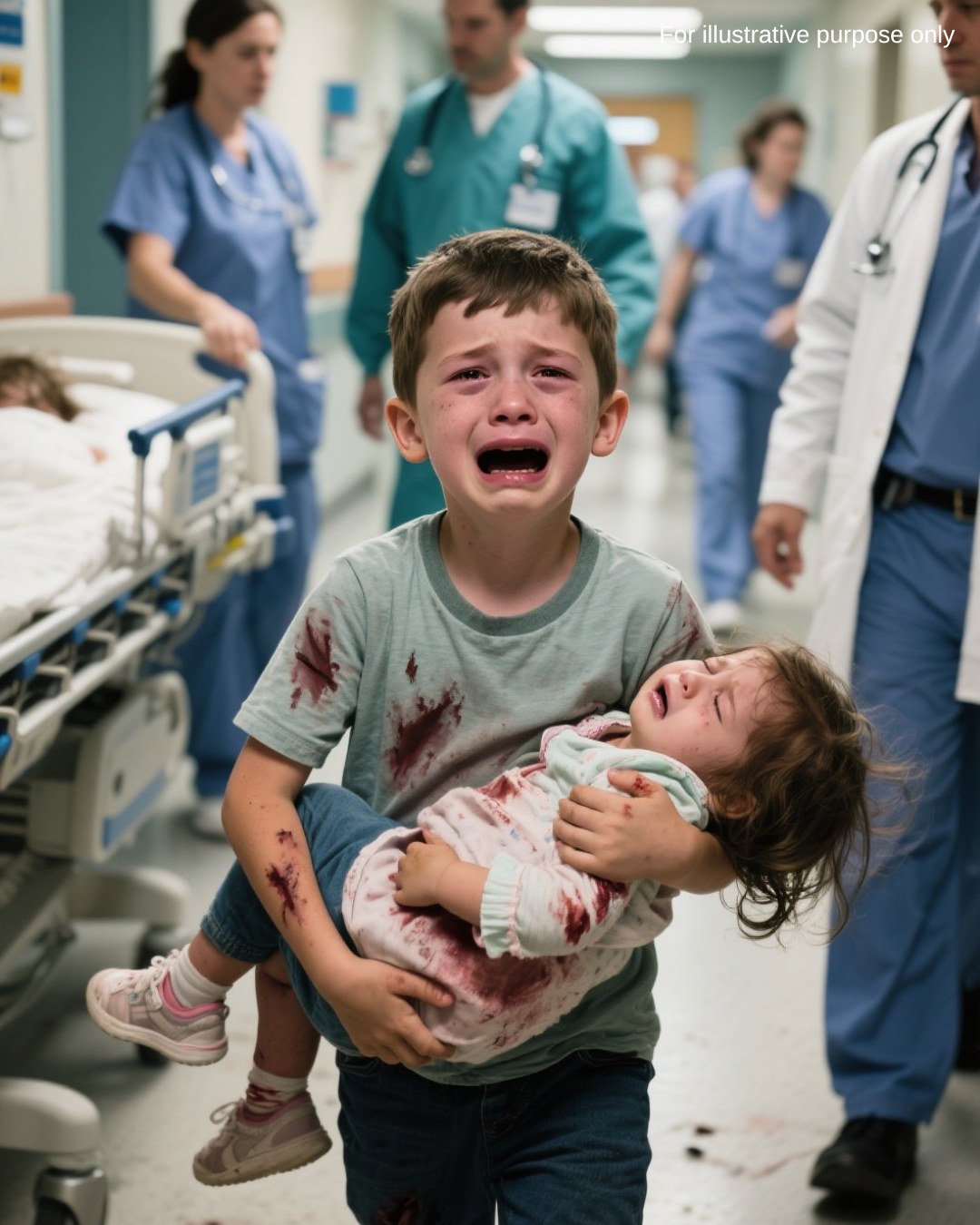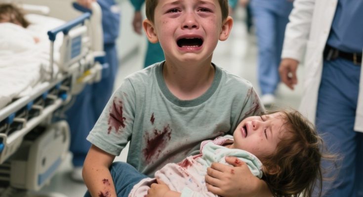 In one hospital bed, a broken seven-year-old boy curled around his baby sister like a shield.