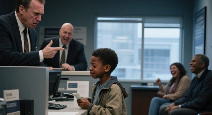 The bank manager, Tristan Vale, paused mid-motion and studied the boy as if he were a curiosity behind glass. Then a laugh broke out—low, sharp, and cruel—echoing off the marble walls. “Check your account?” he sneered. “This isn’t some charity. Who even let you in here?”