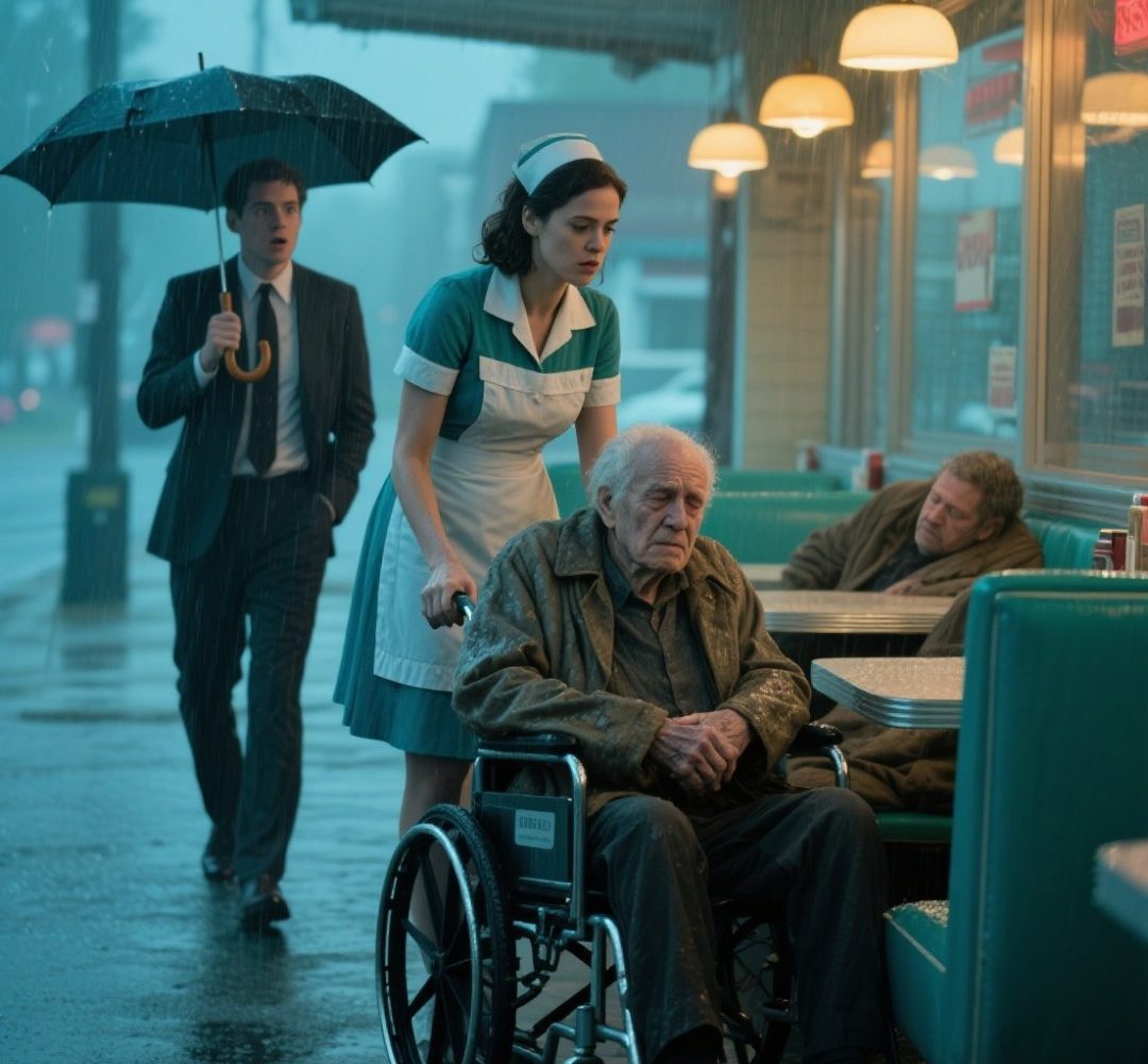That’s when she saw him. Through the fogged glass, barely visible beneath the streetlight, sat an elderly man in a wheelchair. He was hunched forward, rain soaking through his thin jacket, his hands shaking uncontrollably as water streamed down his face. There was no car nearby. No one calling his name. Just him, alone in the storm, as though someone had left him there and erased him from the world.